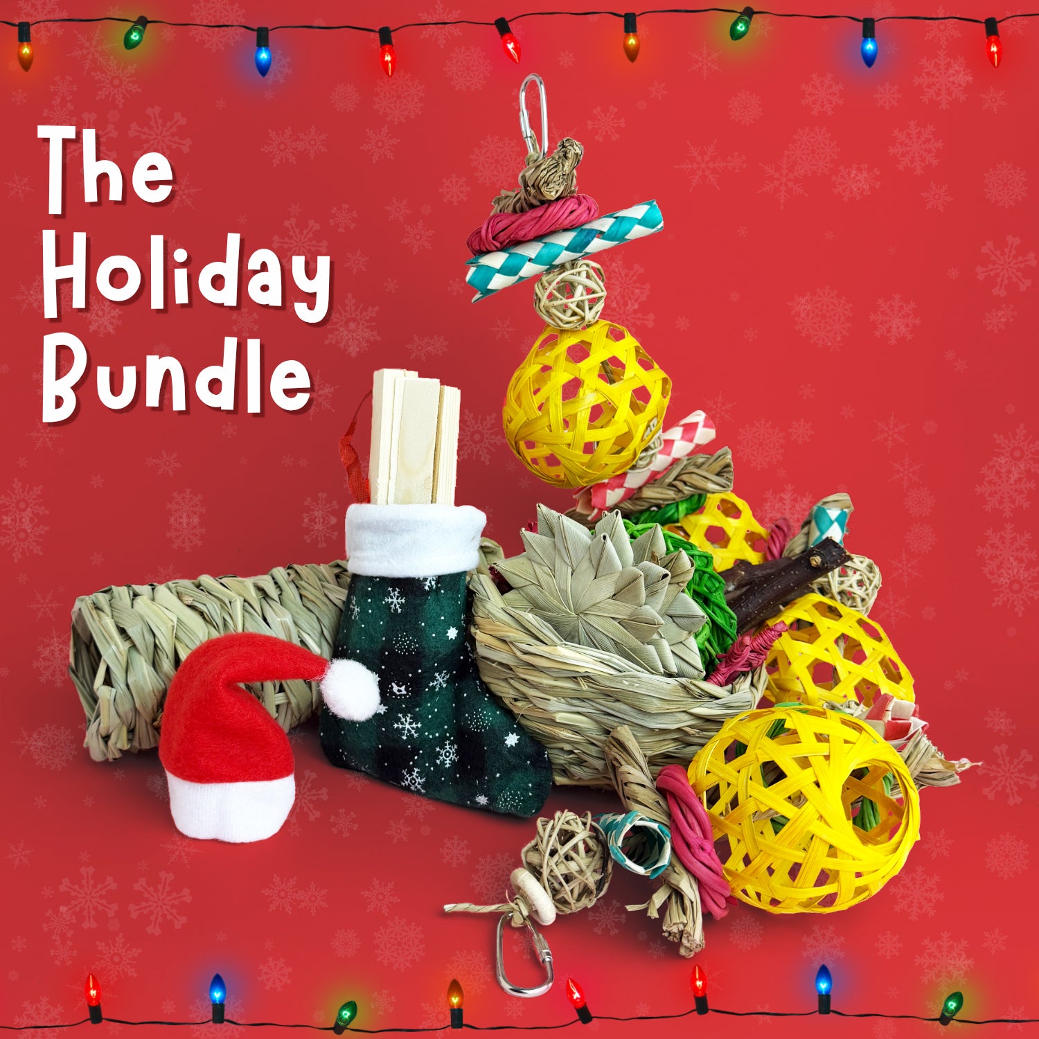 HO HO HO! Our Holiday Bundle features a HUGE 24" Jingle Garland with bamboo “jingle bells” for stuffing and chewing and removable hooks for use as a toss toy; a Festive Forage Basket with Chinmas wreaths, a bundle of firewood, and Palm-settias; a Stocking Full of Trimmings (with a surprise pattern!); a seagrass Yule Tunnel; and of course, a Pal-sized Santa Hat! 🎄